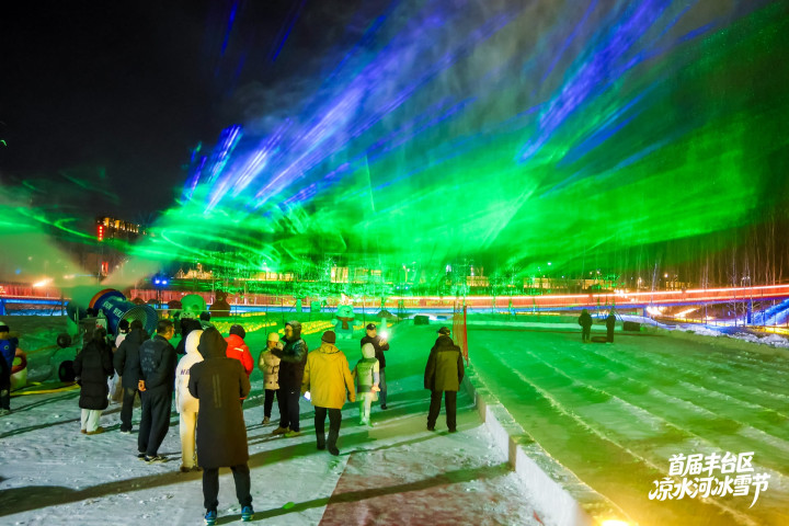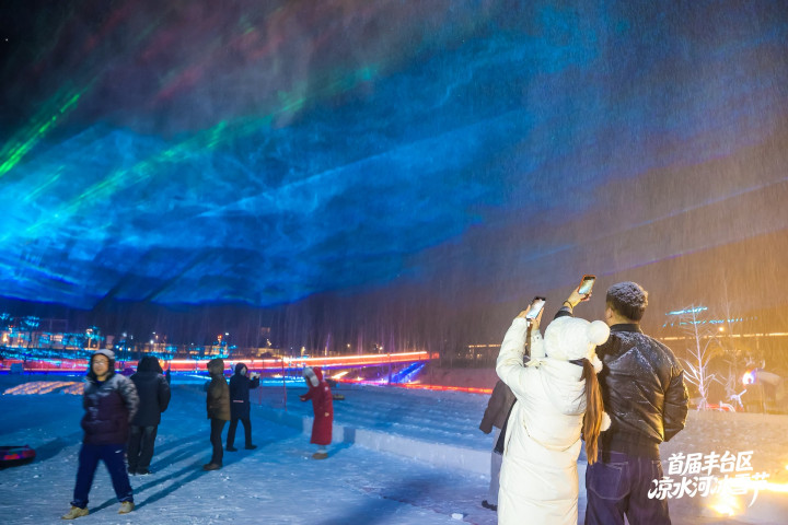 夜色渐深,当温度计的指针降到零下3摄氏度,凉水河冰雪节的重头戏运行了:召唤“极光”——造雪机开动,细碎的雪花飘扬在空中,与激光束重逢,营造出五颜六色的“极光”。