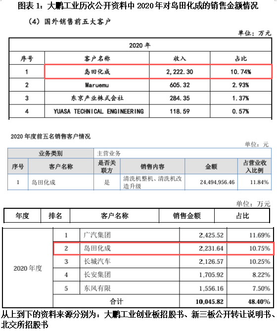 创业板招股书显现,2020年大鹏工业对岛田化成的销售金额为2222.30万元;而大鹏工业呈报新三板时的公开转让讲明书显现这一数据为2449.50万元;呈报北交所时的招股书中,这一数据又变为2231.64万元。