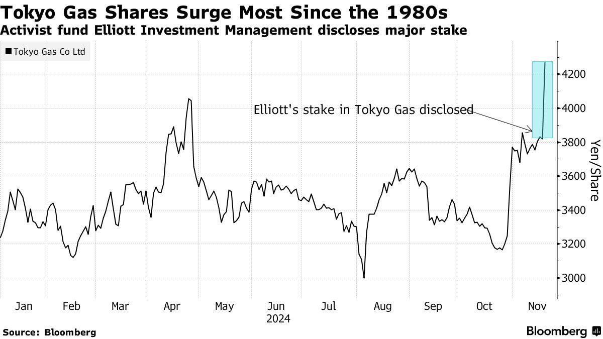 在好意思国知名激进维权投资机构Elliott Investment Management示意现在捏有东京燃气公司(Tokyo Gas Co.)股份,况兼可能立即向该公用管事公司建议“垂死建议”后,日本国内投资者以及一些外资机构大范畴涌入这家低调的公用管事公司,永恒以来波澜不惊的东京燃气公司股价在周三大幅飙升超15%。