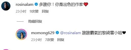 吴沚默还十分感谢锺澍佳导演令她的作品不错成为剧集,亦感谢每一位导演编剧的奋勉。而姚子羚、岑丽香、林夏薇、姚子羚留言感谢Momo写出如斯出色的演义!