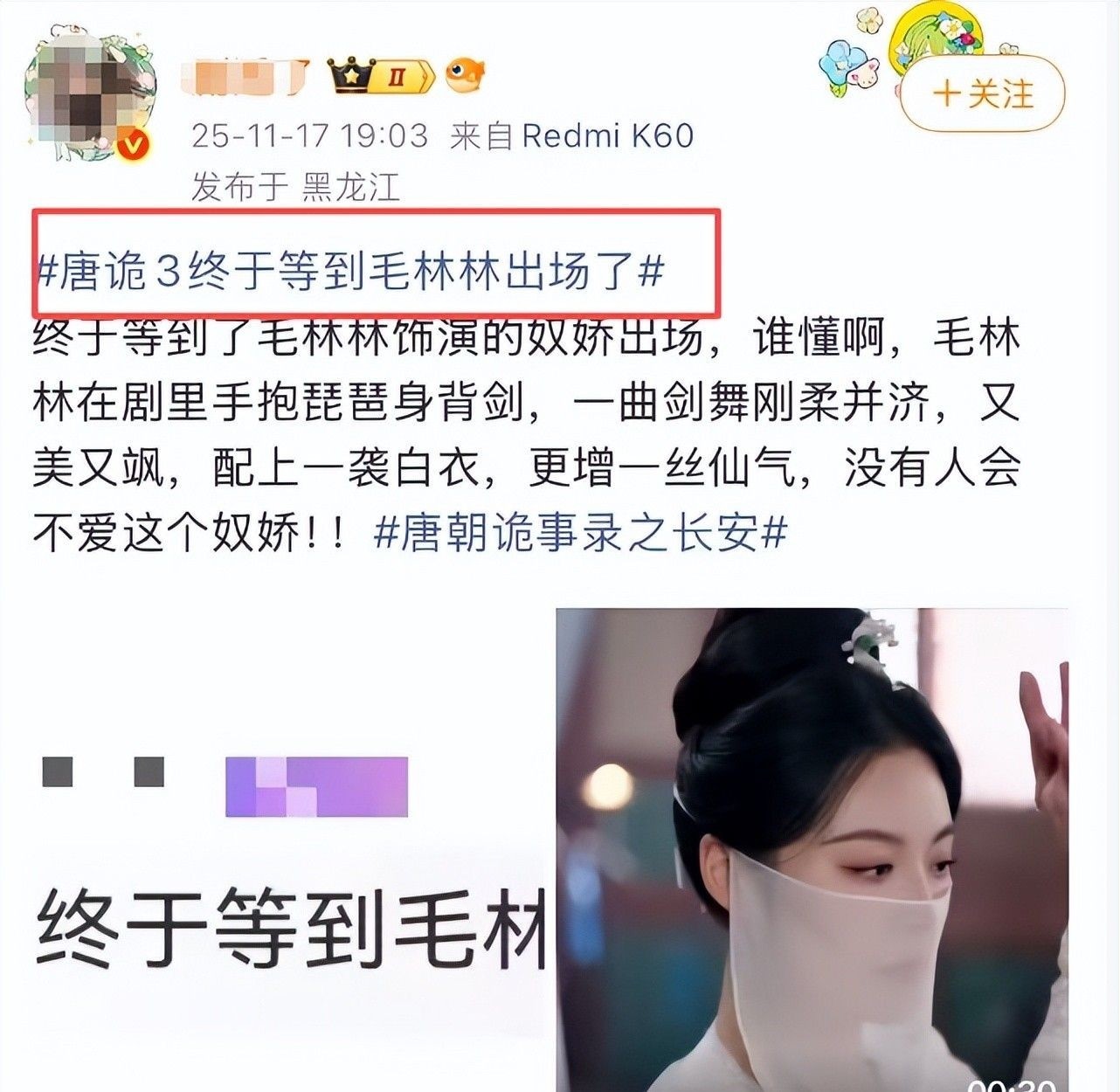7. 11月17日,《唐诡3》“旗亭画壁”章节认真上线,毛林林饰演的奴娇骤然引爆全网热度。