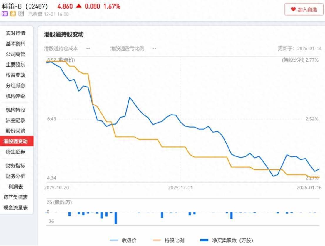 尔后港股通对科笛的抓股比例又在客岁10月和11月进行了新一轮出清,11月11日降至2.45%,尔后场内港股通资金再次减速了流出速率,截止1月16日,其抓股比例仍有2.29%。