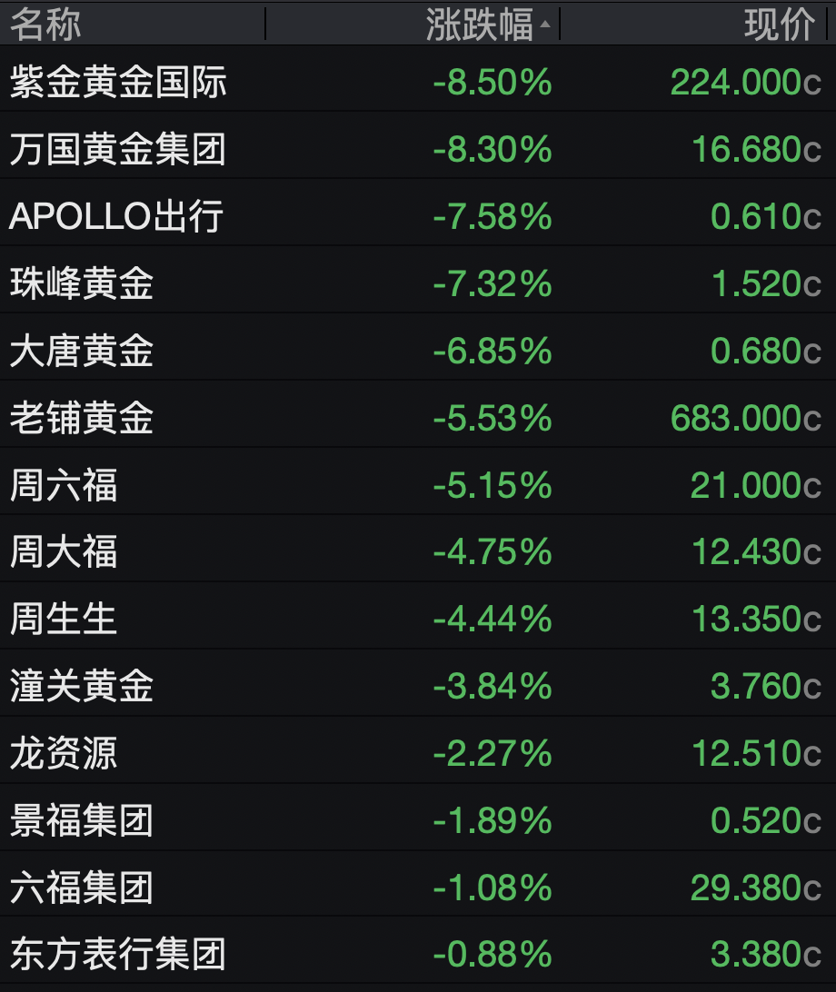 黄金股雷同大跌,紫金黄金外洋、万国黄金集团均跌超8%,老铺黄金、周六福跌超5%。