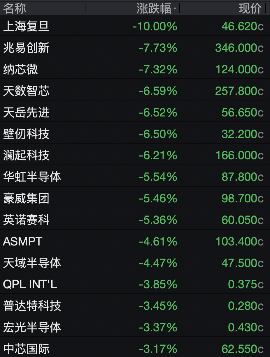 半导体、芯片股集体大跌,上海复旦跌10%,兆易改进、纳芯微跌超7%,澜起科技跌超6%,中芯外洋跌超3%。