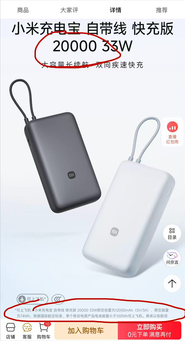 华商报大风新闻记者通过网购平台搜索该款小米充电宝,干系宣传海报在显眼处标注20000字样,售价129元。记者精通到,该商品笃定页最下方的基本参数中先容,其产物型号为PB2033,电板额定能量为74Wh(7.4V 10000mAh),电板电芯能量75.48Wh(7.4V 10200mAh),额定容量12000mAh(5V/3A),页面边缘又对额定容量使用小字进行了注视:“额定容量:该充电宝在5V/3A放电环境下,可开释的最小电量为12000mAh。”该页的另一份规格参数表格中写到:“电板容量 20000mAh”。