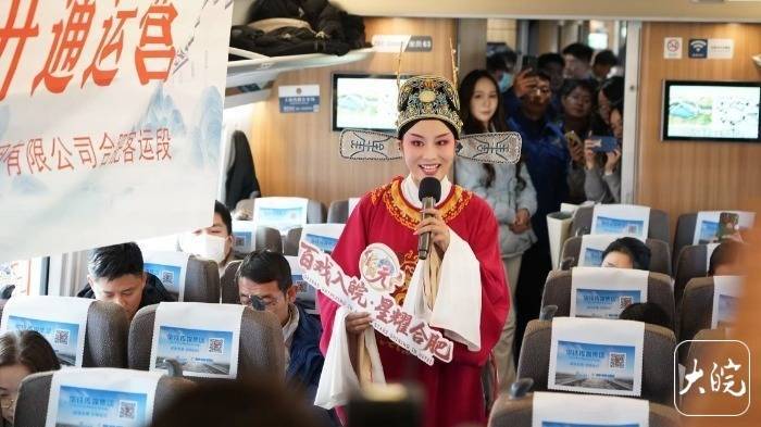 r列车缓缓启动,放心驶向泗县标的。不久后,车厢内响起激荡的音乐,上铁集团合肥客运段准备的黄梅戏《女驸马》片断开动演绎,激荡的唱腔为旅程注入浓浓的安徽风情,引得乘客纷繁拿入手机拍摄。